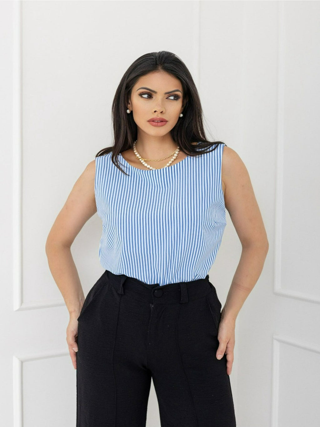 Blusa regata plus size em crepinho listado com gola redonda, confeccionada em poliéster de excelente qualidade. O tecido leve e respirável garante conforto o dia todo, enquanto a costura reforçada assegura durabilidade. Cores sólidas e firmes que resistem a lavagens frequentes. Peça versátil para looks casuais do dia a dia, com excelente custo-benefício. Produto 100% brasileiro com entrega gratuita em até 5 dias úteis.